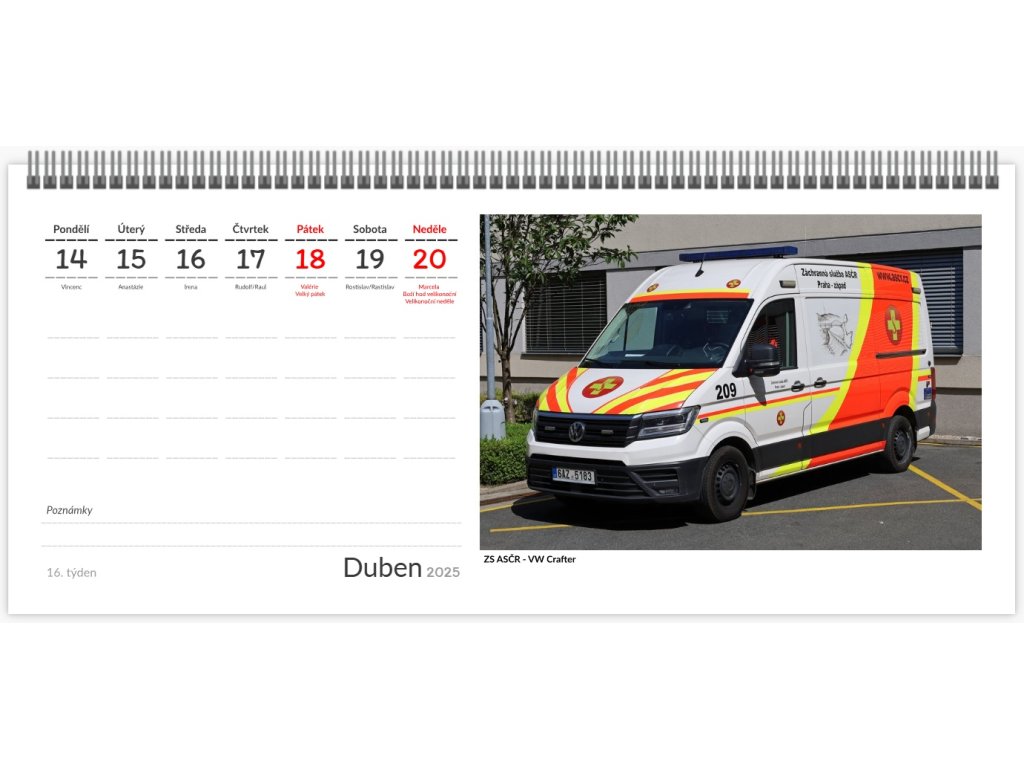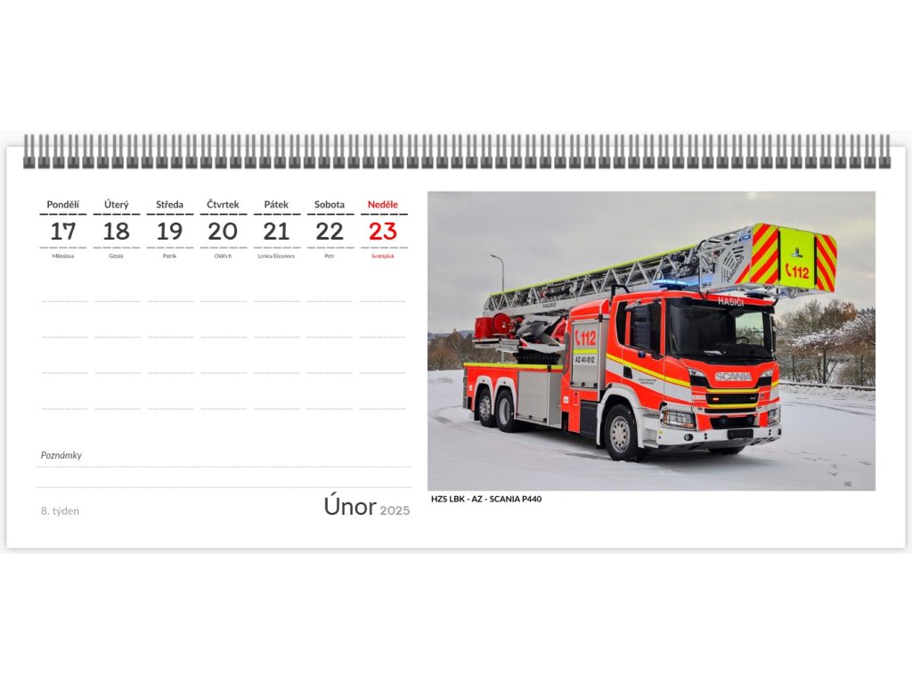 Týdenní stolní kalendář s technikou složek IZS. Kalendář obsahuje fotografie různorodé techniky složek IZS.